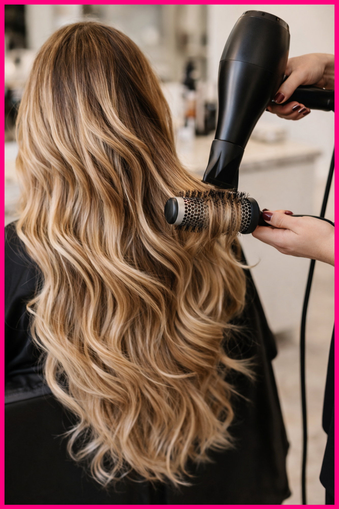 Wash, condition and/or treatment if necessary. Blowout with round brush to a nice smooth volume finish. Can add curls if desired.